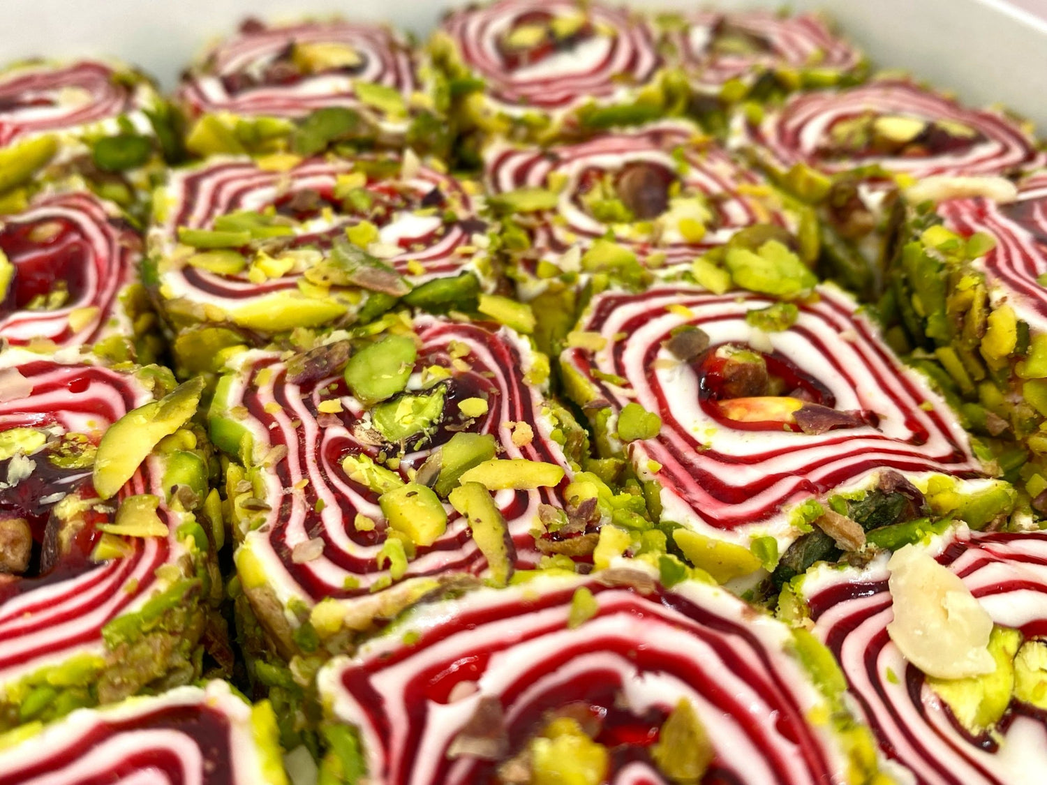 The Ottoman Wrap is one of Ganik Sarsultan's finest Turkish Delights. This variety is made of premium Antep pistachios layered in between a wick made of both a sweet fruity red layer and a white creamy nougat-like layer, with all the ingredients rolled into a wrap and covered with more chopped Antep pistachios. It's as delicious as it is visually stunning!
