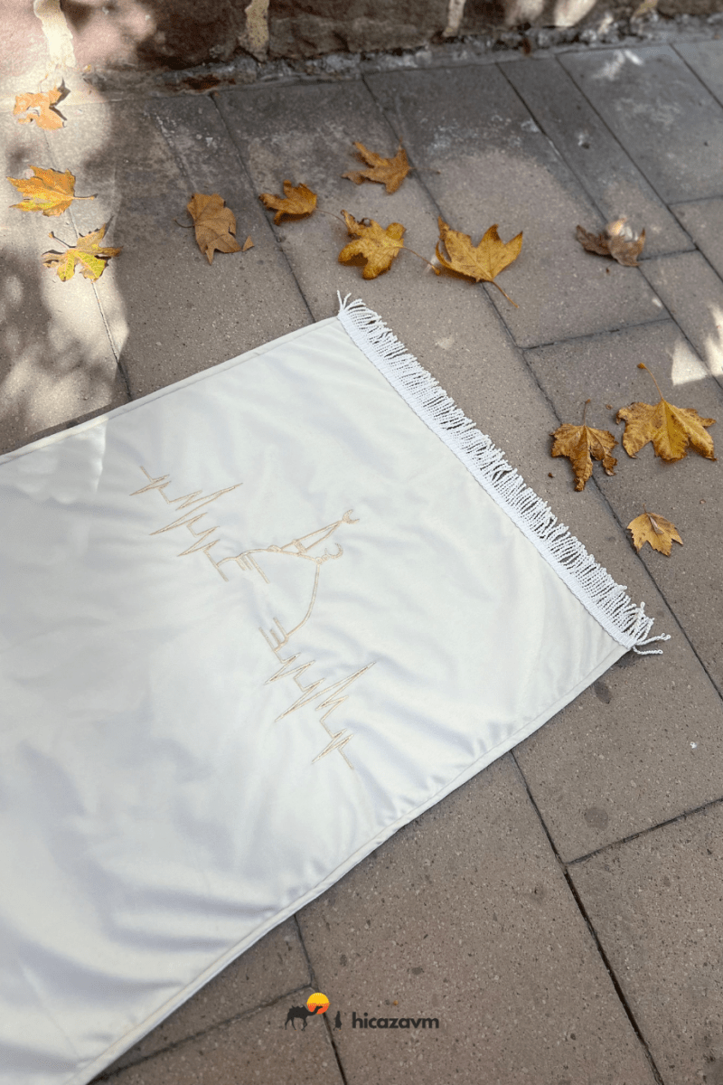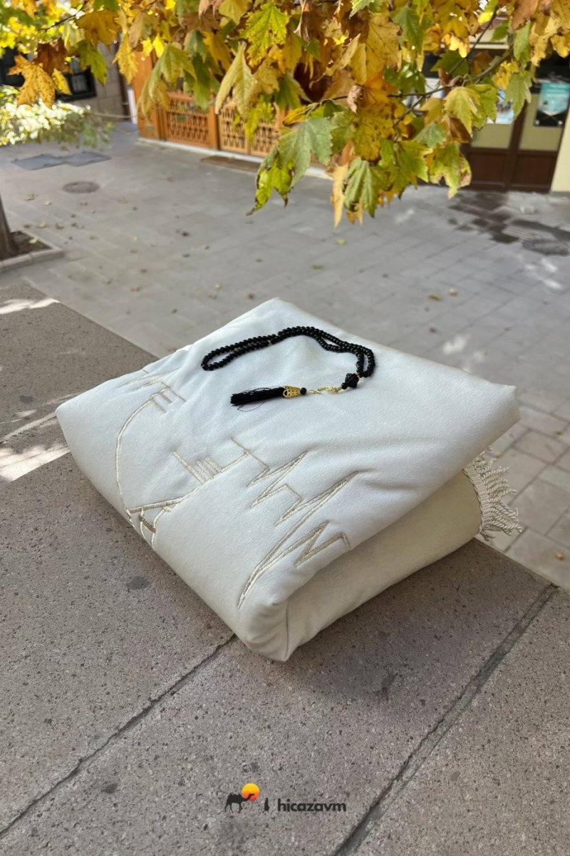 Arricchisci la tua esperienza di preghiera con questo tappeto da preghiera color crema con ricami dorati. Goditi la sensazione lussuosa e il design impeccabile di questo tappeto pacifico e confortevole.
