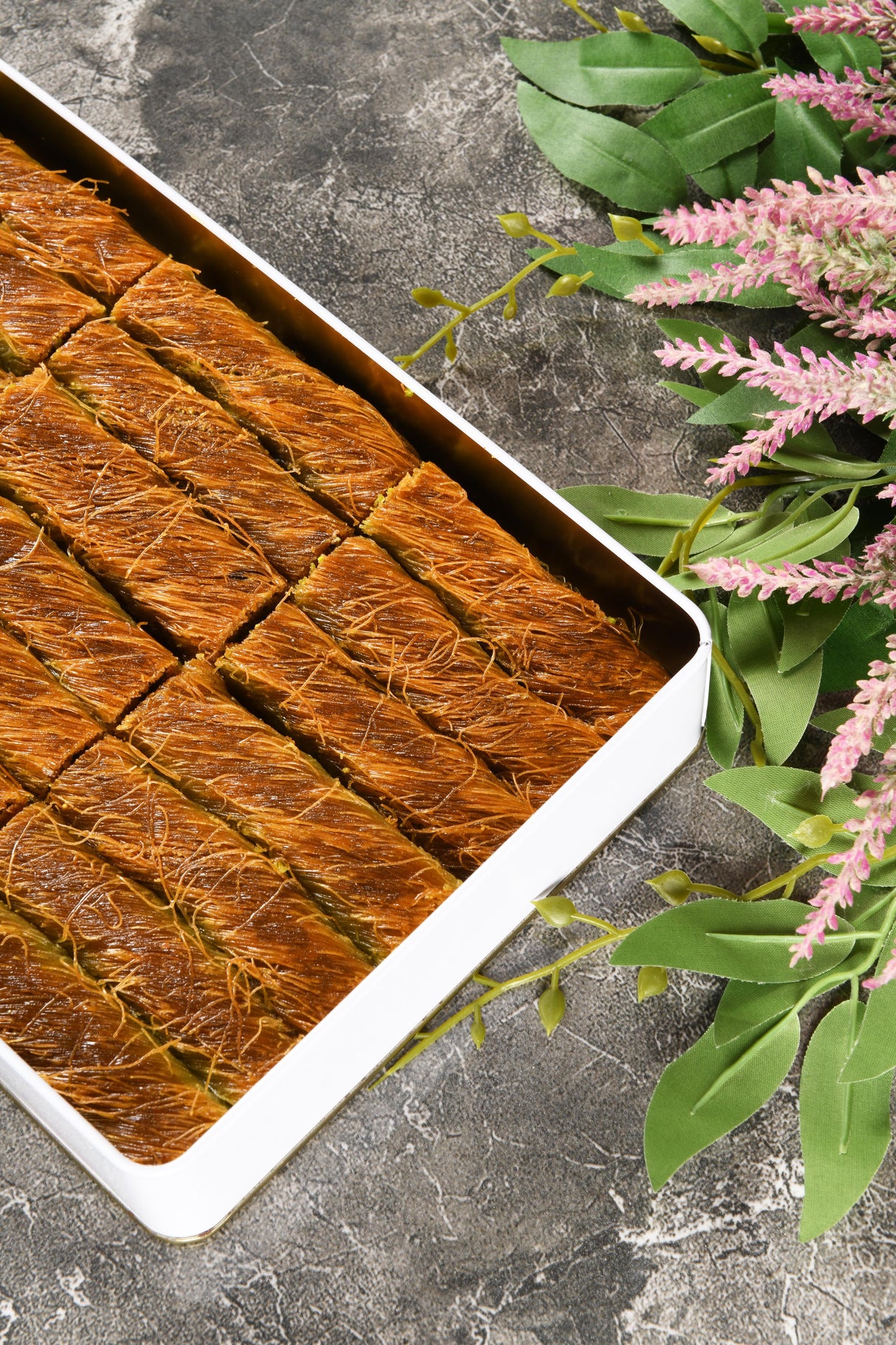 Ingredienti (avvertenza allergeni): Farina speciale per kadayif, burro chiarificato (olio semplice), olio di girasole, acqua potabile, sale, zucchero cristallino granulato, succo di limone e pistacchi (pistacchi grigio-verdi).