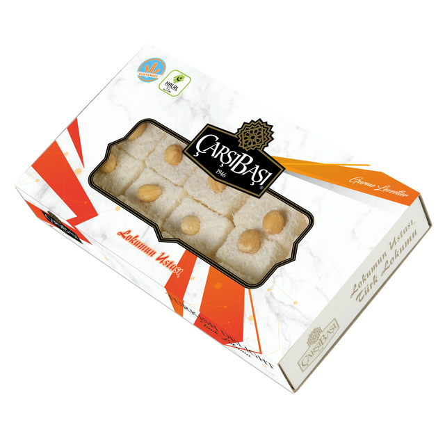 Questa è una vera delizia "Sultan" dal "Lokumun Ustasý" (Maestro del Lokum). Presenta una base morbida e lattiginosa di lokum generosamente guarnita con una nocciola turca intera e premium. Ogni pezzo offre il perfetto equilibrio tra una masticazione morbida e dolce e una croccantezza ricca, nocciolata e soddisfacente.