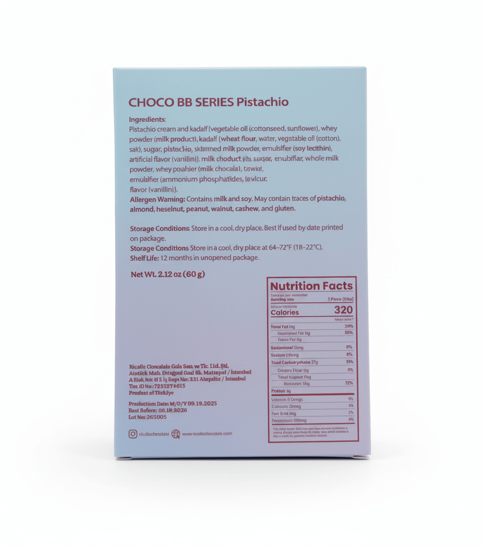- Concetto di Dessert di Tendenza: Sfrutta la popolarità globale dei dessert mediorientali e dei cioccolati gourmet ripieni di pistacchio. Questa barretta è un venditore garantito sia per negozi etnici che per rivenditori tradizionali.